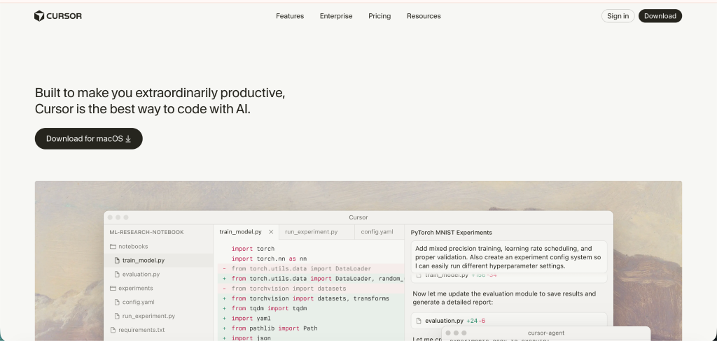 Kalau Lovable dan Bolt membantu Anda melupakan kode, Cursor justru mengingatkan bahwa kode itu ada. Cursor adalah IDE bertenaga AI, dirancang khusus untuk developer. Workflow umumnya: mulai aplikasi di Lovable/Bolt → sync ke GitHub → buka di Cursor → kustomisasi lebih lanjut.